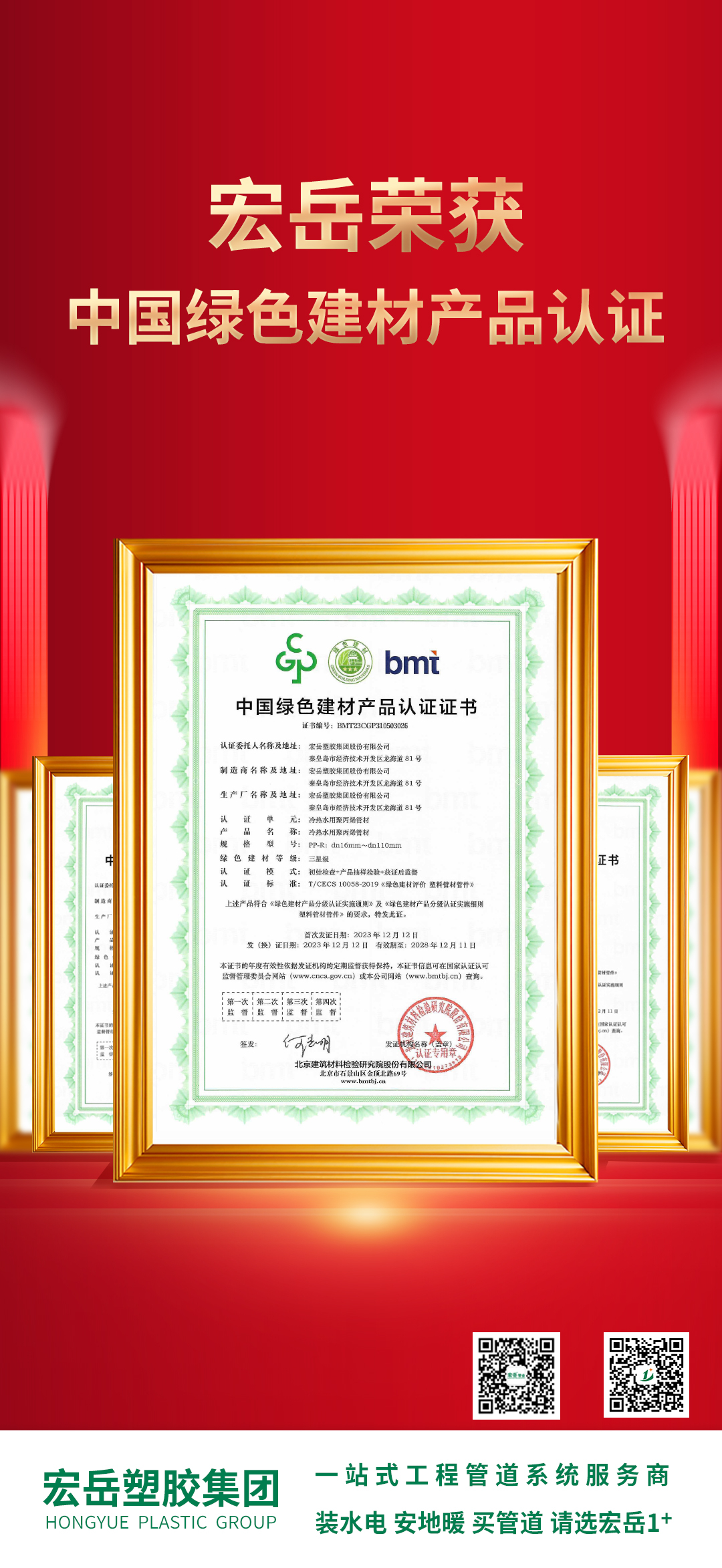 97视频獲得中國(guó)綠色建(jiàn)材產品認證,本次認證對PPR、PVC、PE、PE-Xa、PE-RT管材管件(jiàn)等11個單元的係列產品,以環(huán)保、節能、節水、循環、低(dī)碳等評價(jià)維度進行了相關審核,97视频集團順利通過(guò)。