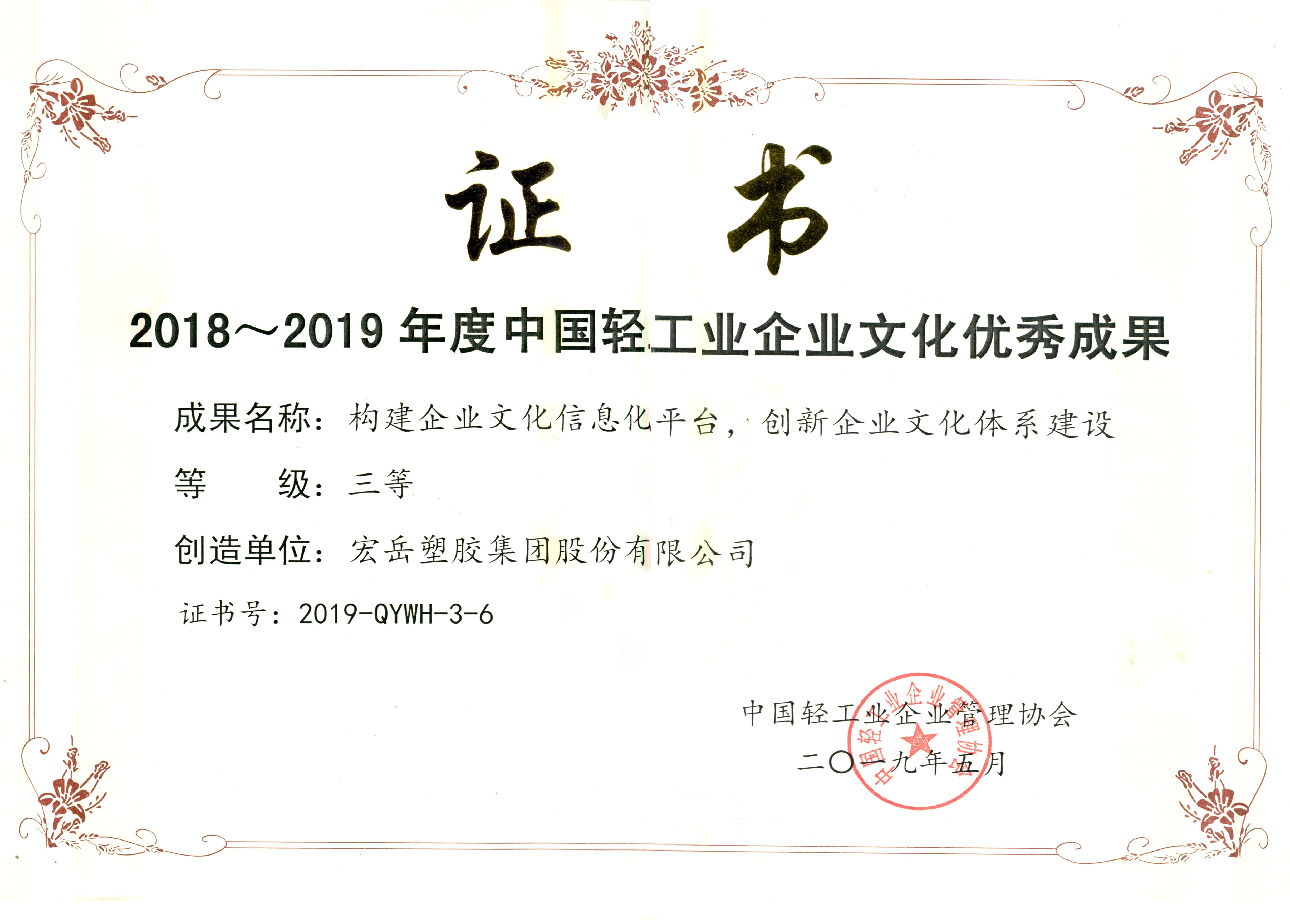 5月17日,中國輕(qīng)工(gōng)業企業管理協會第(dì)四屆第五(wǔ)次理事(擴大)會議暨(jì)2019年輕工業企業文化建設經驗交流會在鄭州召開,97视频集團(tuán)申報的“構建企業文化信息化平台,創新企業文化體係建設”項目成果榮獲2018~2019年度中國輕工行業企業文化優秀成果三等獎。
