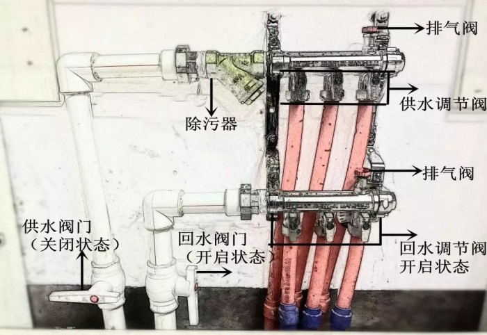 5、打開分集水器(qì)上各路供回水調(diào)節閥和暖氣供水總閥門。